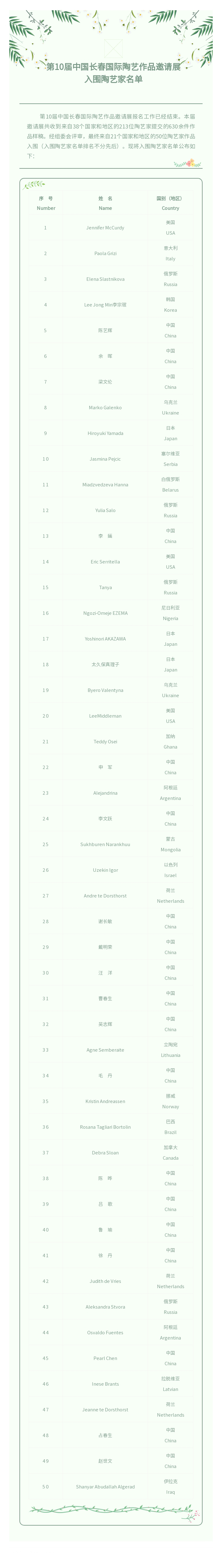 2020第九届中国长春国际陶艺作品邀请展参展陶艺家名单...